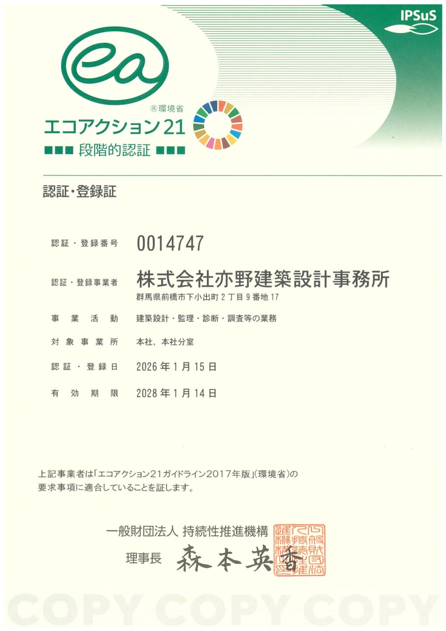 2026年1月15日に弊社は環境省が策定した環境マネジメントシステム「エコアクション21」の認証・登録証を取得いたしました。